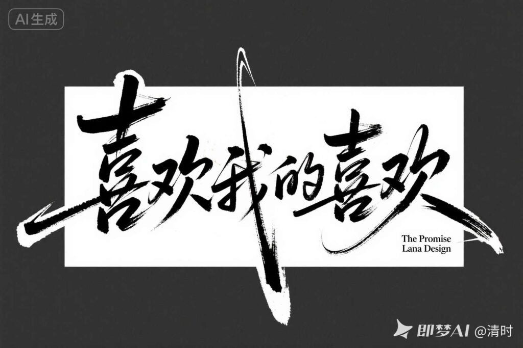 书法字体海报“ 喜欢我的喜欢”,草书字体狂野奔放,字横排,超粗笔画流畅飘逸,笔画巧妙延长变形,飞白效果,笔画流畅潇洒,干净背景,大师海报作品,电影海报,英文“ The Promise”和小字“Lana Design”作为点缀