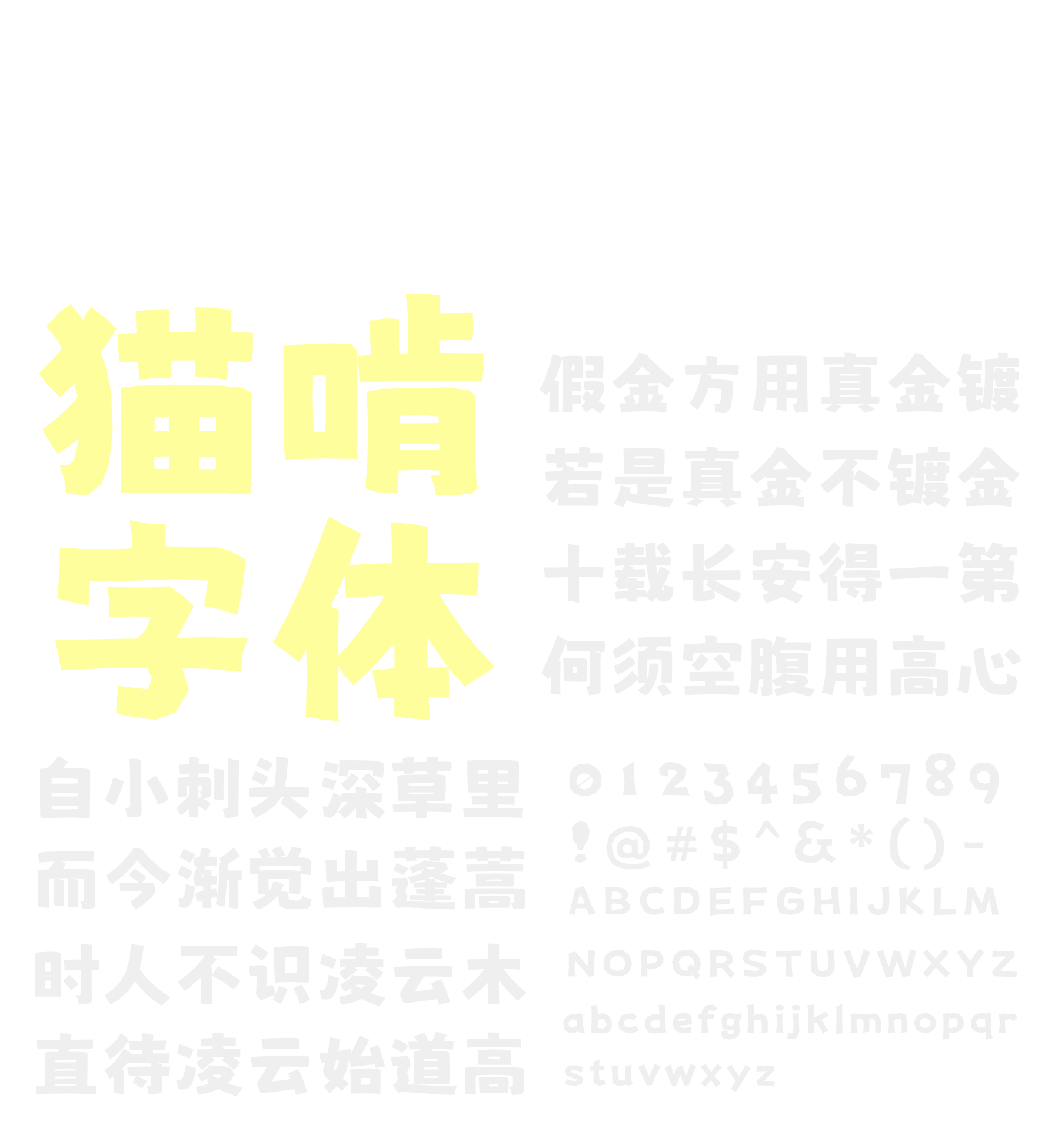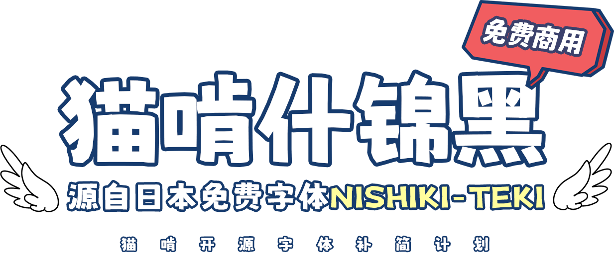 猫啃什锦黑是基于日本作者Umihotaru创作的字体Nishiki-teki(日文名:にしき的フォント)进行简体字补充的一款字体。这个字体的补简工作是由ZERO子主导,联合荆南字坊、时光羊、白日月球、帆影、频凡、Skylinext、阿東東東東、orj等(排名不分先后)一起共同历经千辛万苦完成的。