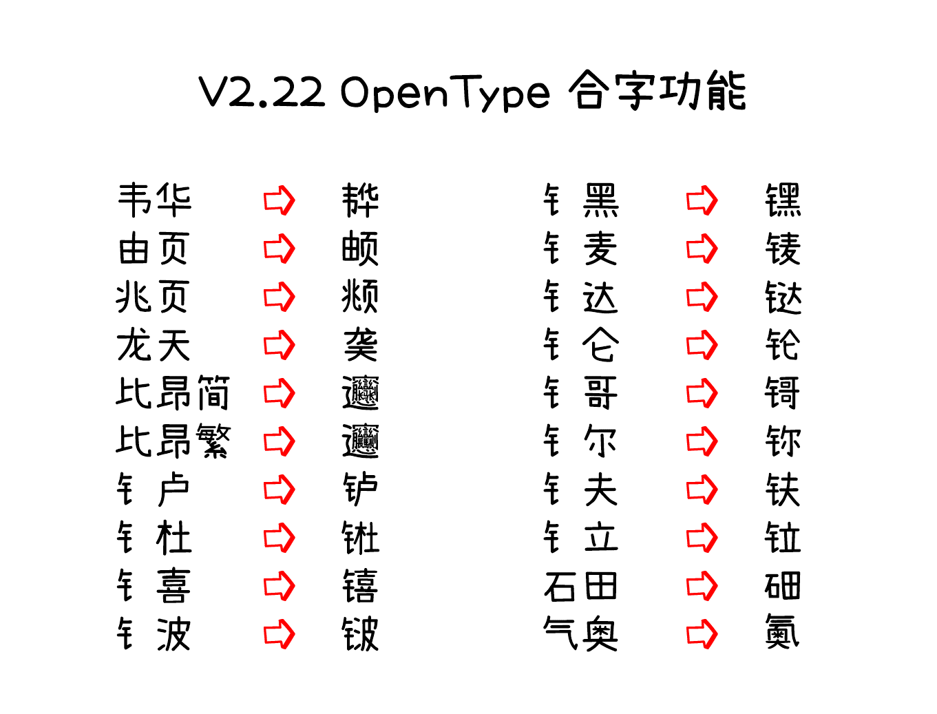 • 添加了利用 OpenType 连字功能打出一些目前普通输入法根本打不出生僻字的功能。理论上支持 OpenType 功能的软件(如 PS、AI 等)都能打出来,但需要开启 OpenType 连字功能。Word 2016 需要在“字体”对话框内点击“高级”选项卡,将“OpenType 功能”里的“连字”选择为“历史和任意”或“全部”。 点击查看