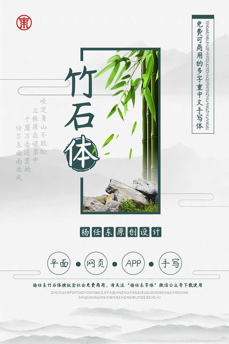 杨任东竹石体按照GB2312-80书写,并增补了少量常见汉字,单个ttf格式字体文件包括7311个字符,涵盖了日常生活用字99.8%的需求;整套字体有7个字重,也就是共有7个ttf格式字体文件,全套字体共计50000余个字符。