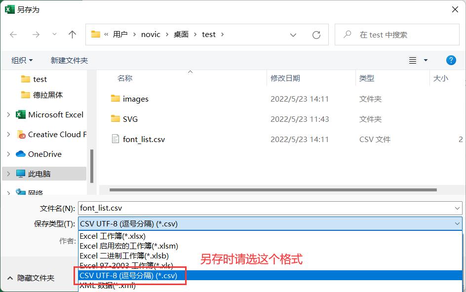 10、然后把这个Excel表另存为csv格式,这样我们就得到了一个svg文件与文字一一对应的列表了。