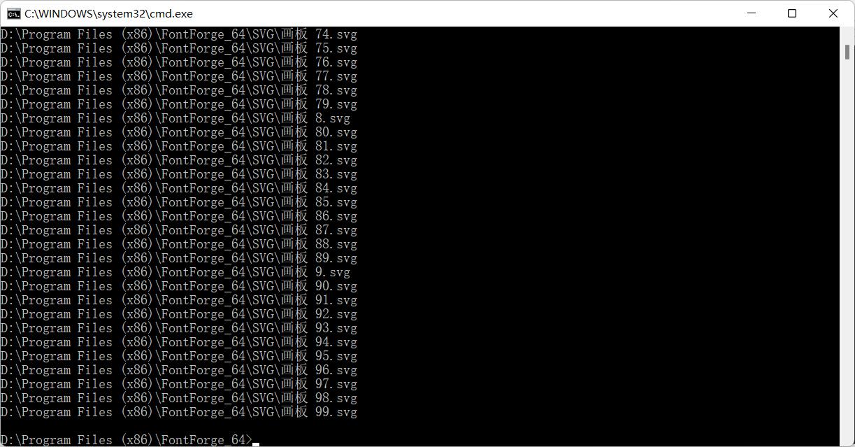 至此,导出字体为svg文件的工作就完成了。下面准备把这些svg文件导入到FontForge中并生成字库文件。