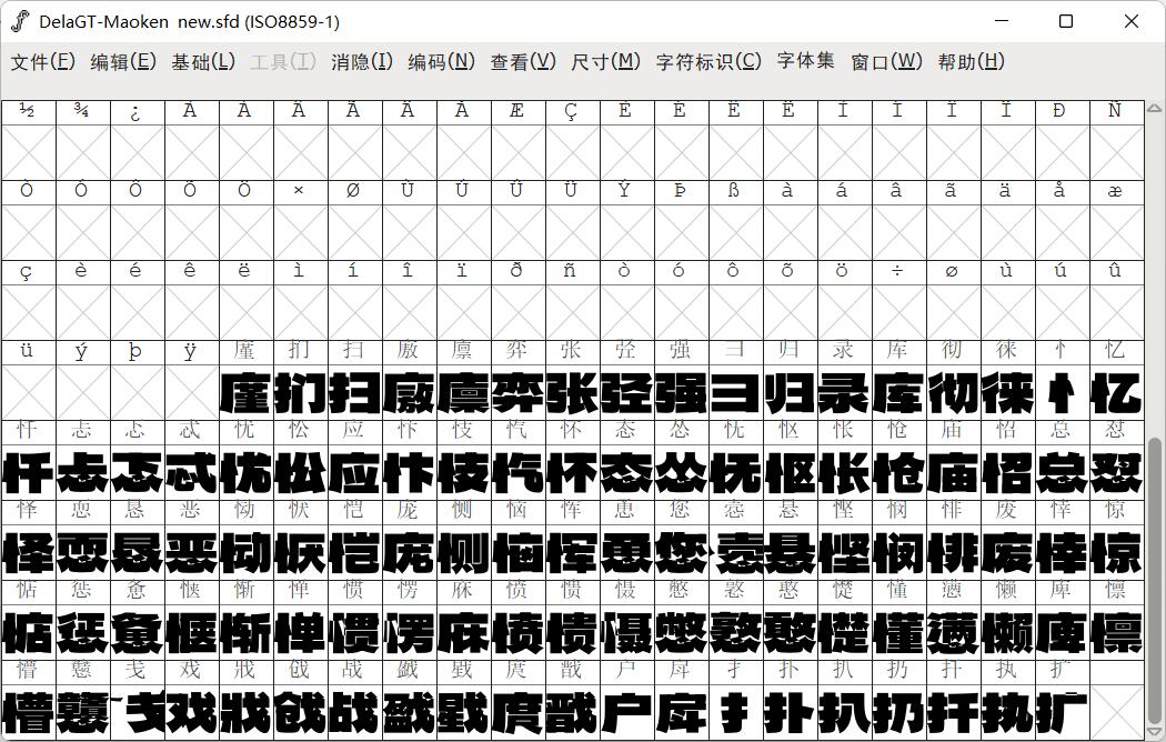 15、最后我们打开这个sfd文件看一下,完成啦。字库的一些信息的设置,请参考猫啃君之前发表的另一篇文章《小白教程,如何使用FontForge修改字体的名称?》