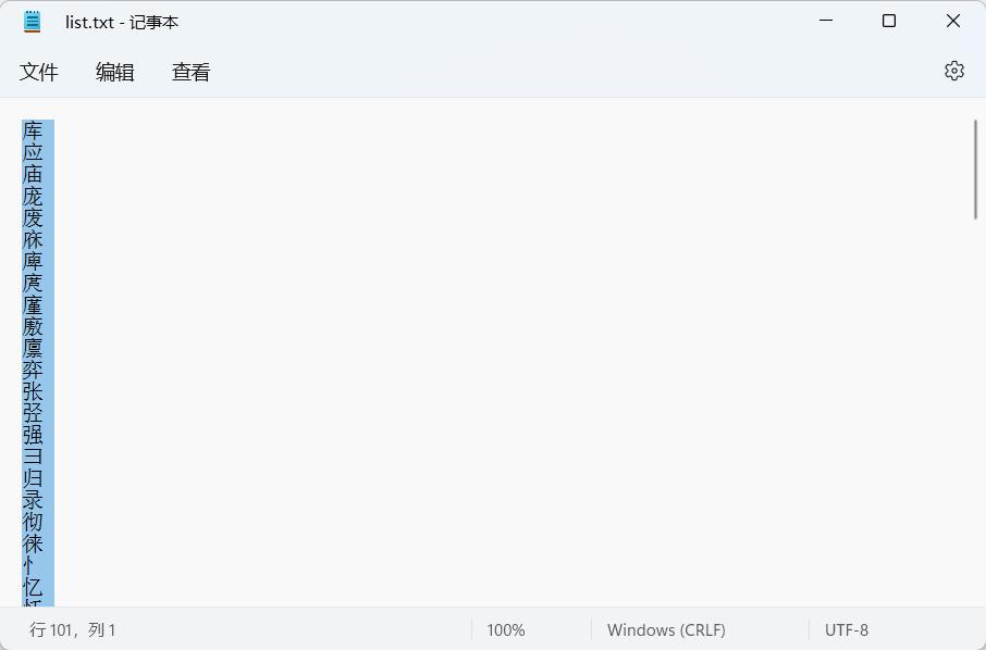 8、然后打开之前准备好的造字的顺序的列表(猫啃君这里的示例的列表文件名为list.txt),按菜单 “编辑->全选”(快捷键Ctrl+A) 选中txt文件里面的所有行,Ctrl+C复制