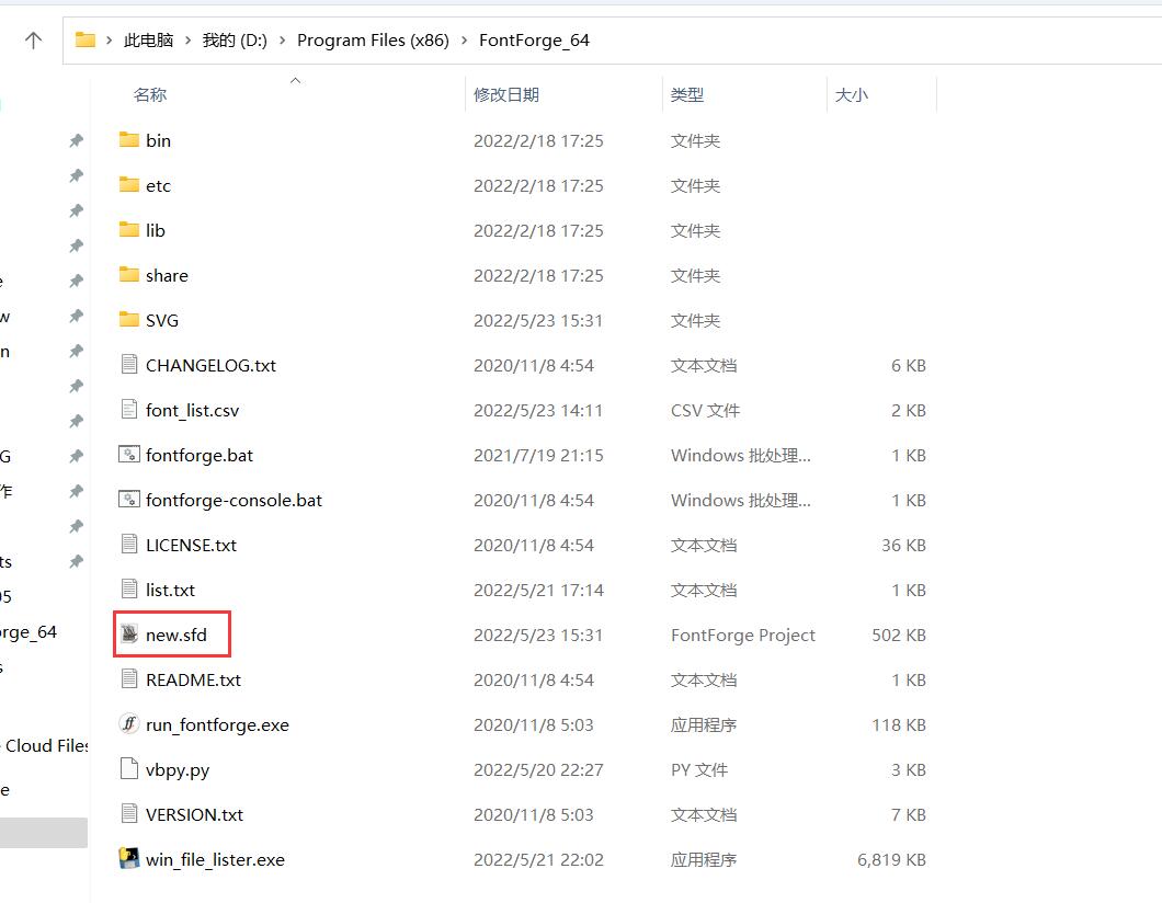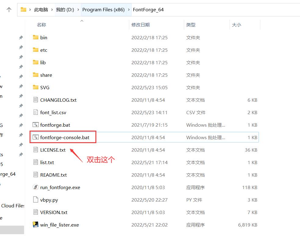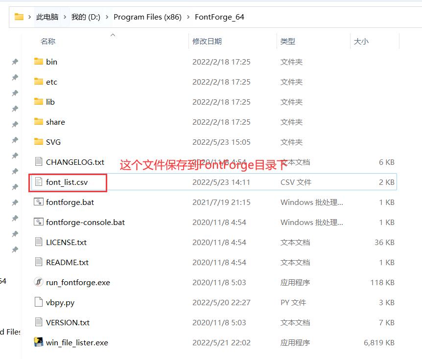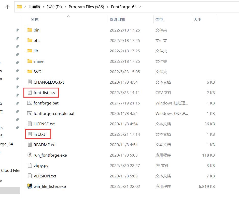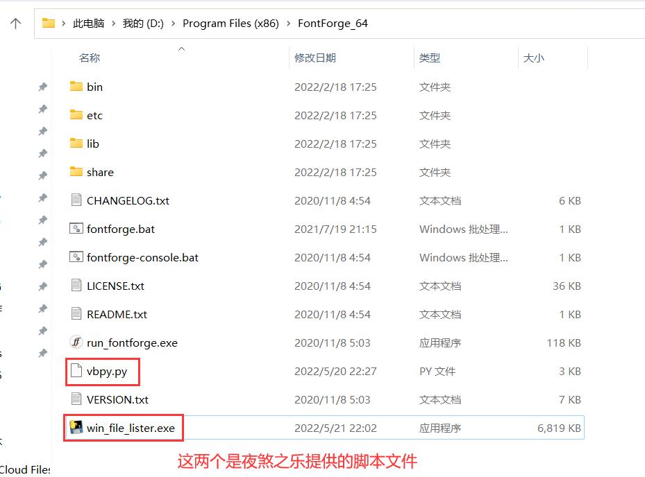 1、我们先把在猫啃网上下载的FontForge解压出来,这个FontForge是绿色版的,解压出来就可以用了。比如猫啃君把FontForge解压到D:\Program Files (x86)\FontForge_64目录下。其中win_file_lister.exe是@夜煞之乐为方便生成字体文件列表写的一个可执行程序,运行后会把所在的文件夹的文件列表生成一个txt文件。vbpy.py是一个批量导入字体的python脚本文件。