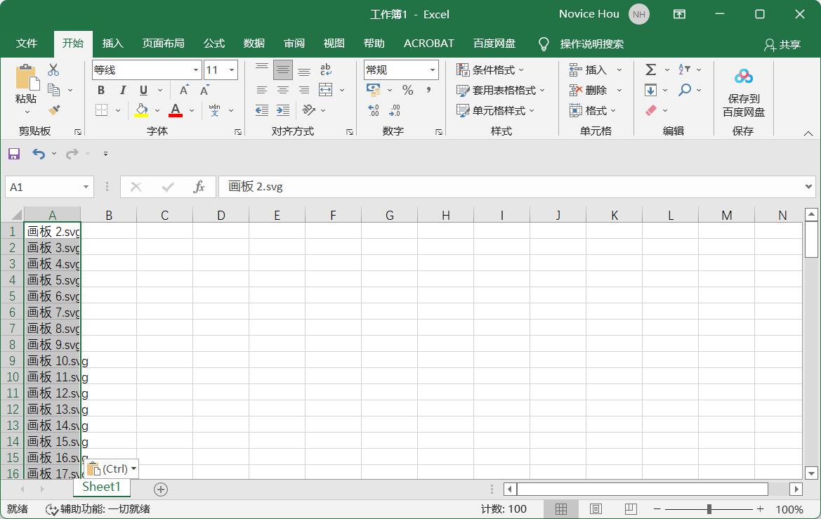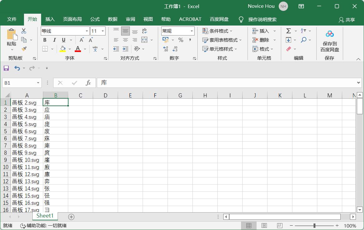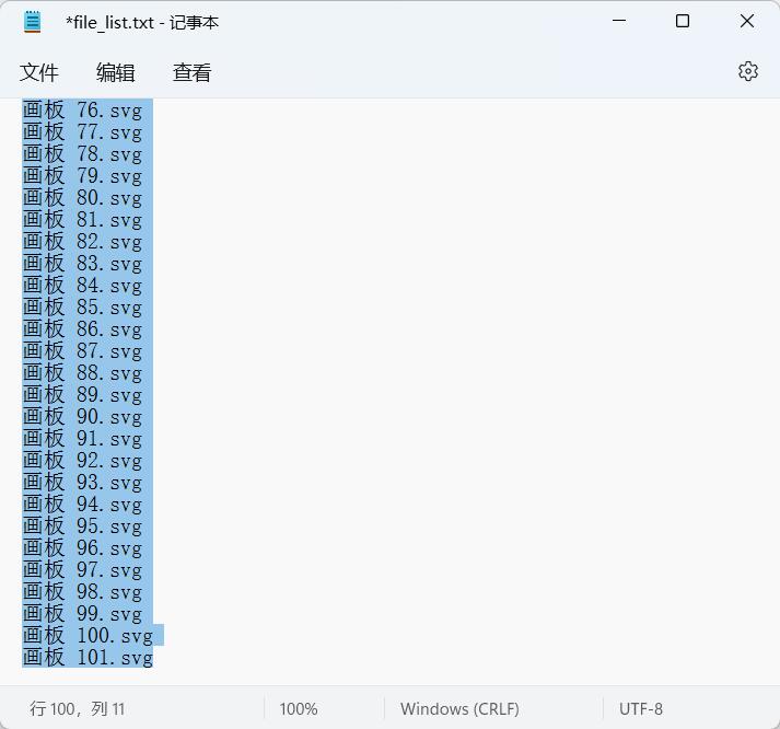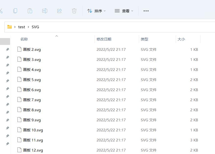 通过上面的操作步骤,我们已经得到单独的字体的svg文件。但是现在存在一个问题,这些svg文件的名字都是“画板 1.svg,画板 2.svg…”这样子的名称,我们无法得知这些svg文件对应的是哪个字。这个时候,我们之前准备好的字体列表文件就有用了。