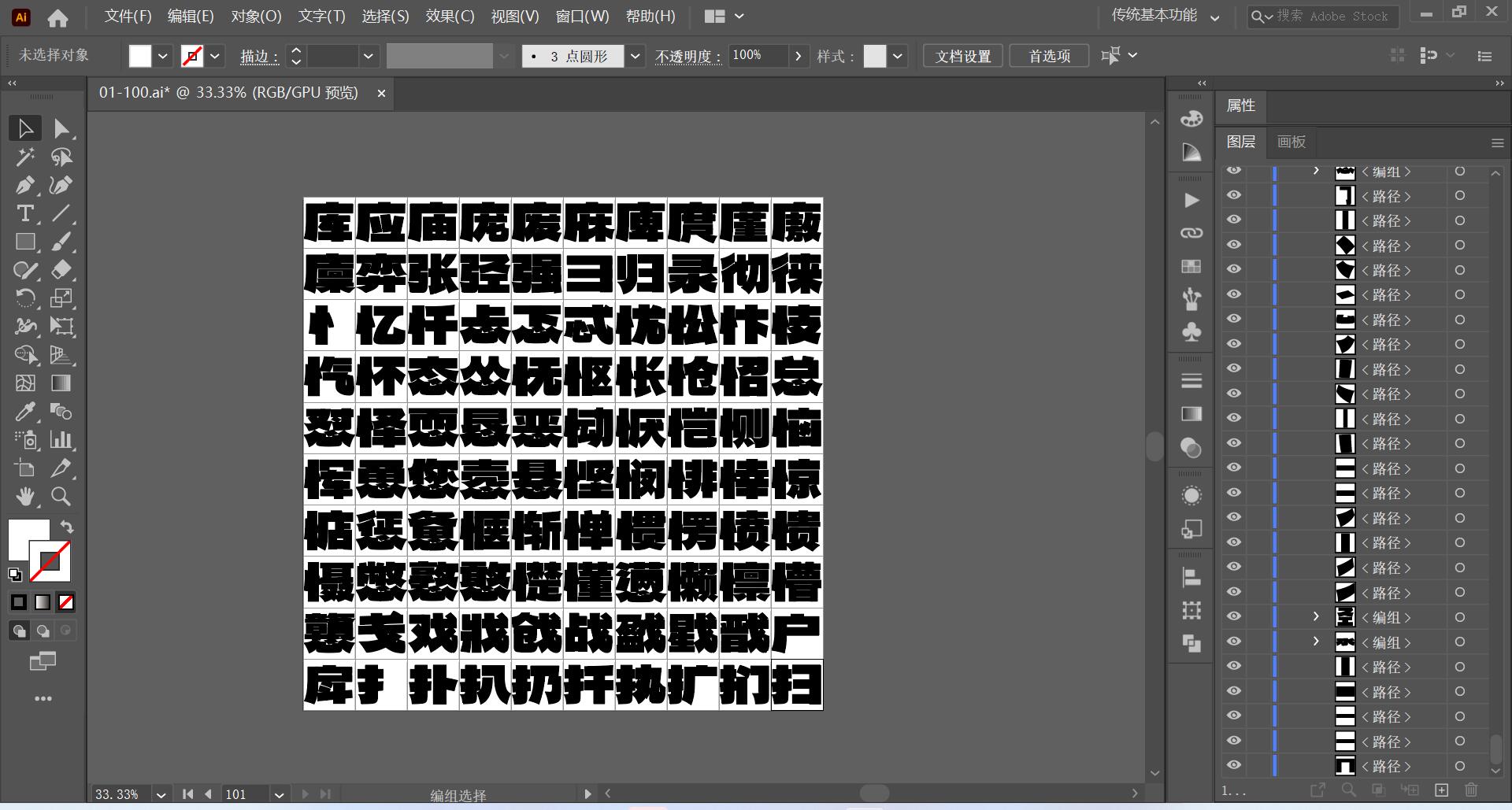 在准备好上面的这个文字列表文件后,我们就可以开始在AI中进行字体设计了。在AI中进行字体设计有两种方式,第一种方式是每个字先建立好独立的画板进行设计,第二种方式是在一个画板上先做好字体的设计,然后再分割成多个画板。下面以猫啃君正在补简的德拉黑体为例: