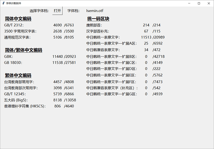 下面这个图统计了这款字体里面包含多少个简体字数繁体字数等信息,方便大家直观地了解这款字体的简繁字体数量。中国大陆的小伙伴只需特别关注GB2312和3500字常用汉字表的数量就可以了。这个统计软件是来自马来西亚的网友“夜煞之乐”编写提供给猫啃网使用,十分感谢他的分享!如果您想下载这款字体统计软件,可以在GitHub或者码云进入该软件的开源项目进行下载。
