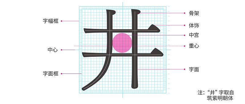 提到重心就要引出与其相对应的名词,叫做中心。中心指的是字幅框几何中心的交点,它是实际存在的点,我们在设计字的时候通常以中心来调整字重心的位置,而不是将二者混为一谈。(如下图)